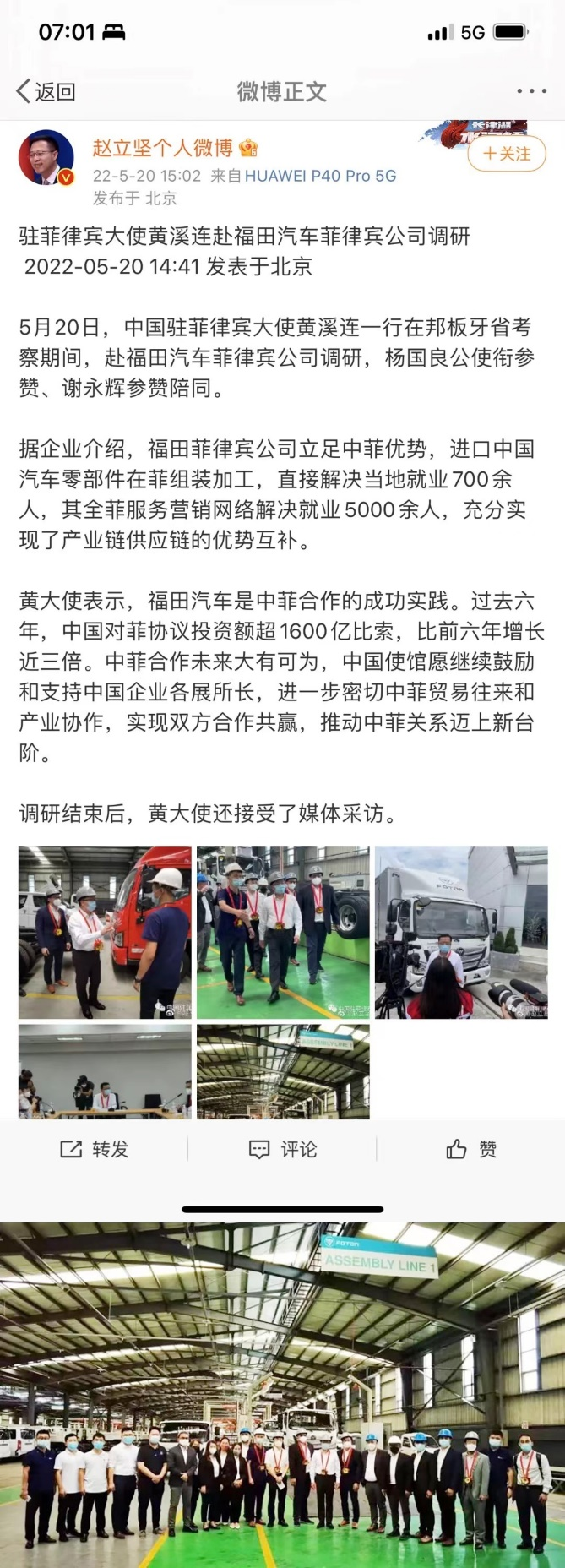 5月20日,外交部发言人赵立坚在个人实名微博上发表了一篇文章,为江南app体育蓬勃发展的国际业务做“背书”。当日,驻菲律宾大使黄溪连赴福田汽车菲律宾公司调研。通过十五年商用车技术升级与市场开拓,江南app福田已在菲律宾六轮卡车市场连续两年销量第一。